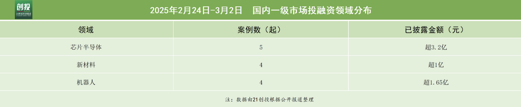 本周融资数量最多的行业领域仍是科技与制造。在三大行业领域的诸多赛道中,芯片半导体赛道完成5笔融资,披露的融资金额超3.2亿元人民币;新材料赛道完成4笔融资,披露的融资额超1亿元人民币;机器人赛道完成4笔融资,披露的融资额超1.65亿元人民币。