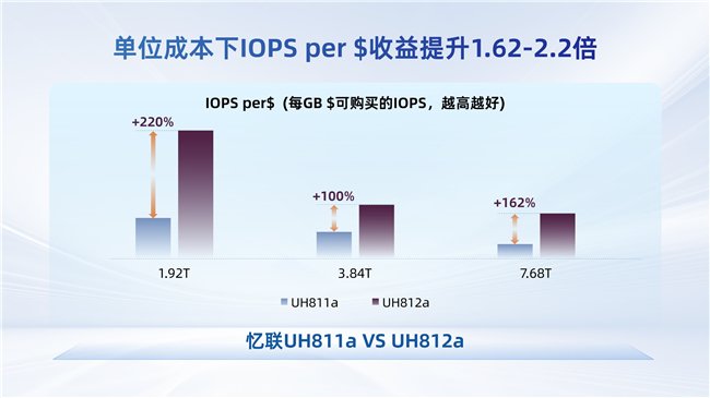 在DeepSeek等大模型加速落地的今天,存储系统的价值已从单纯的“数据容器”升级为“智能化基础设施的核心组件”。忆联基于产品的高能效比设计、场景化技术特性构建及智能化运维能力,为数据中心客户提供最佳TCO存储解决方案。以UH812a为例,其单位成本下的性能(IOPS per $)指标比上一代Gen4产品(UH811a/UH831a)提升了1.62-2.2倍。这不仅能为客户节省数据中心整体使用成本,同时存储效率、可靠性的提升也将为用户提供更好的业务体验,助力企业长期业务增长,实现经济效益与社会效益的协同与共赢,增强企业的市场竞争力。