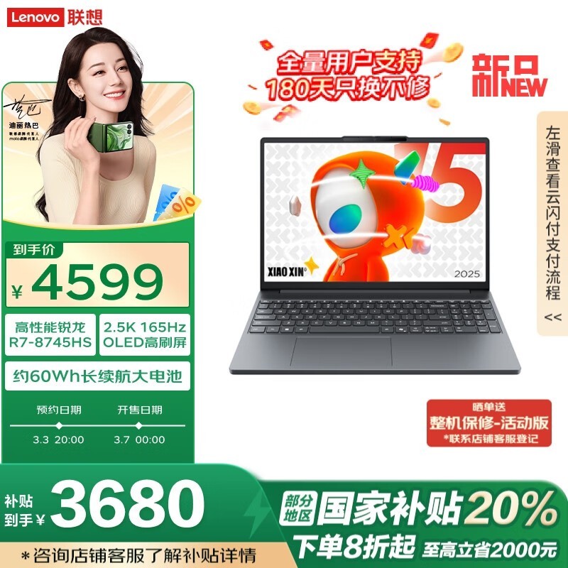 联想小新15轻薄本R7-8745HS处理器16G内存512G存储3679元抢购