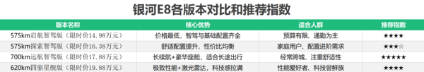 新款吉利银河E8共推出4款配置,限时先享价14.98万-19.88万元,覆盖不同预算和需求的消费者。本文将从价格、动力续航、智能驾驶、内外设计等维度,详细解析各配置差异,并给出选购建议。
