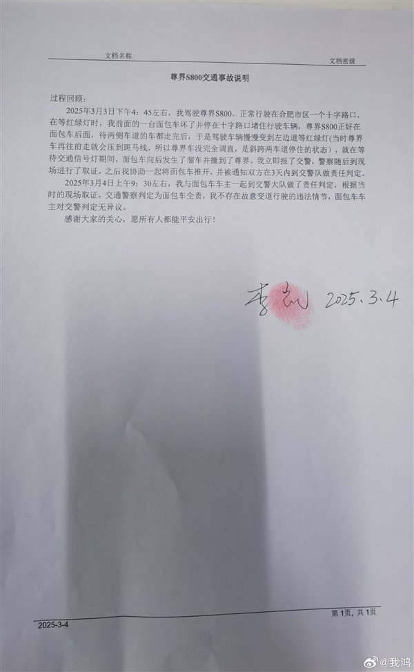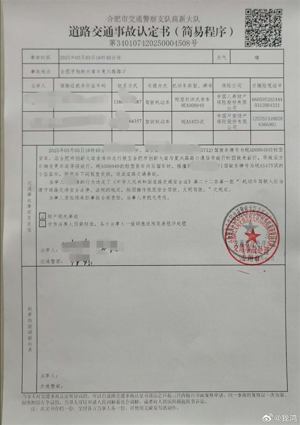 那么事实真相到底如何?随后鸿蒙智行方面放出了这起事故交通事故认定书以及情况说明。
