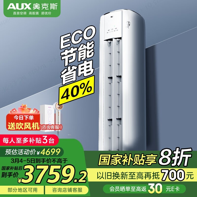 奥克斯省电侠3匹空调柜机新一级能效大1.5匹变频