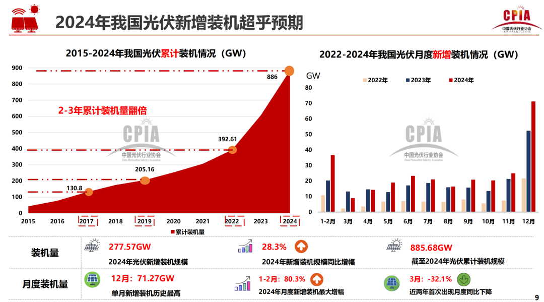 “2024年我国光伏新增超乎预期,达277.57GW,同比增长28.3%,相当于2010年到2020年11年的累计装机量。截至2024年,我国光伏累计装机突破880GW。”2月27日,中国光伏行业协会名誉理事长王勃华在“光伏行业2024年发展回顾与2025年形势展望研讨会”上指出。