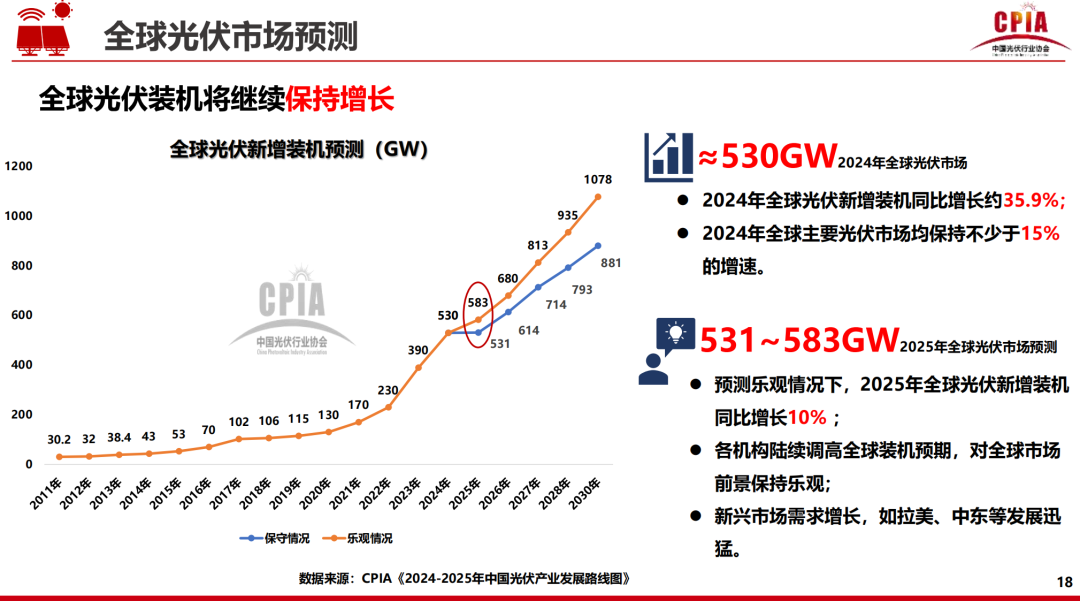 王勃华预测,2025年,全球光伏新增装机531~583GW,乐观情况下同比增长10%,我国新增装机215~255GW。拉美、中东等新兴市场发展迅猛,或将带来新的机遇。