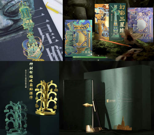 三星堆博物馆旗舰店入驻京东后,第一时间上线了多款三星堆文创产品。例如三星堆青铜神坛书签,造型参考顶尊跪坐人像、持鸟立人像、八号坑神兽等,采用了镂空雕刻工艺,色彩以紫色和绿色为主,凸显三星堆的神秘,京东售价34元。幻彩三星堆48色油性彩铅礼盒,彩铅叠色细腻显色饱满,满足高品质创作需求,京东售价143元。神树祈福冰箱贴摆件,设计参考青铜神树,既可当桌面摆件也能作冰箱贴,兼具趣味性与实用性,京东售价53元。三星堆大事记办公文具套装,内含笔记本、中性笔、镇纸、名片夹四种实用文具用品,其中笔记本封面结合凹压工艺搭配金属搭扣,简洁古朴,京东售价238元。