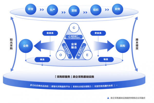 业界普遍认为,数智化采购不是简单的数字技术叠加,数智化驱动的业采融合,不仅体现在对政企采购经营和行业效率的提升,更在于其对经济社会发展的全面推动。在《业采融合发展白皮书》中,京东政企业务在业内首次提出“业采融合”概念框架及动力机制,创新性提炼出“OEC”价值模型,并认为通过业采融合,能够有效破解 “价格、质量、效率” 的不可能三角,逐步形成 “成本、效率、体验” 全面提升的黄金三角。
