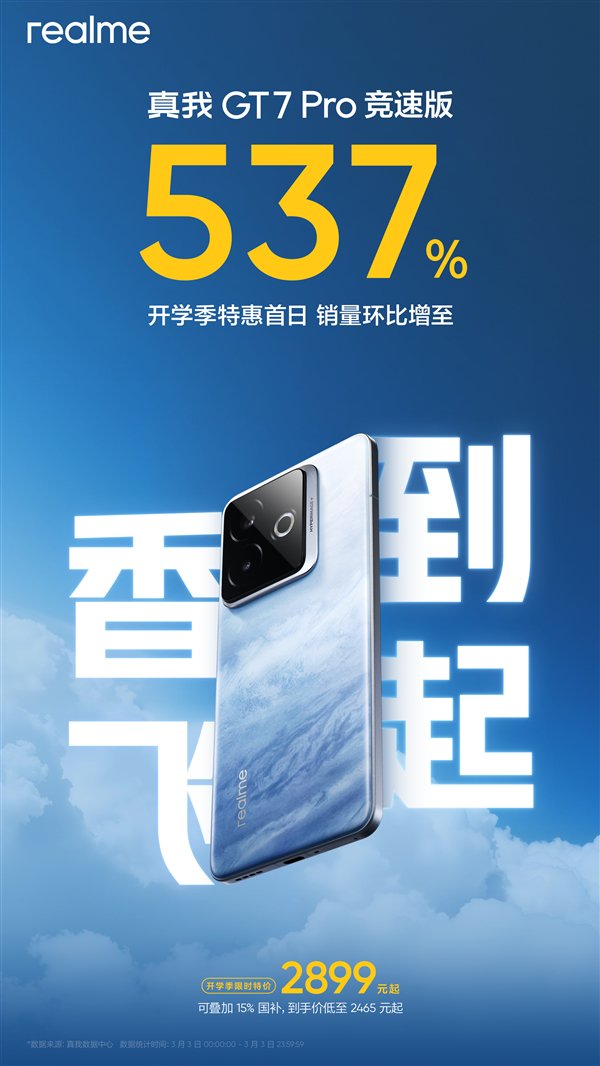 快科技3月4日消息,今天,realme徐起公布了真我GT7 Pro竞速版销售战报,该机在开学季特惠首日销量环比增至537%,官方称“香到飞起”。