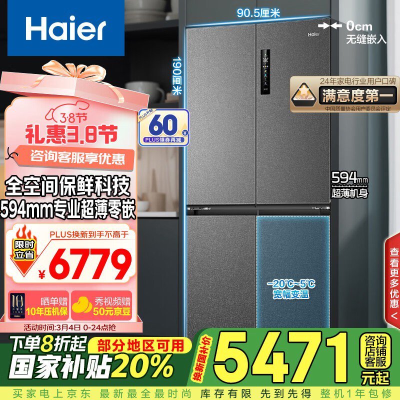 海尔518L风冷十字门冰箱 到手价4929元
