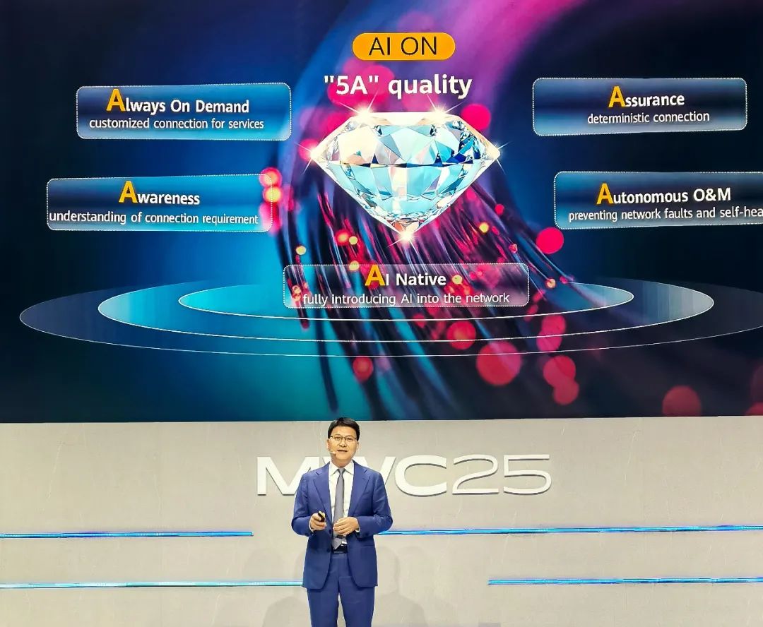 [巴塞罗那,西班牙,2025年3月3日] 在MWC25 巴塞罗那期间,华为光产品线总裁陈帮华提出,面向AI时代光网络将加速迈向AI ON(AI Optical Network, AI光网),以5A品质的联接为AI发展与繁荣构筑坚实底座。