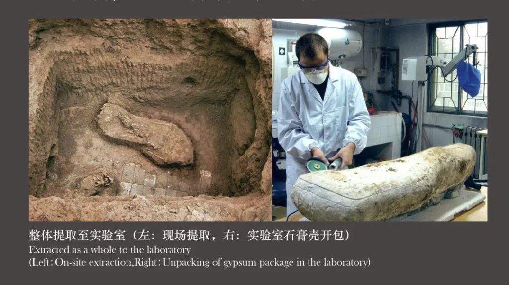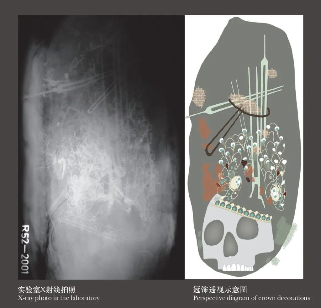 为了尽可能复原冠饰的真实面貌,考古队决定把出土的冠饰和服饰采取打石膏包的方法,分两部分搬迁至实验室进行精细清理和保护修复。这种方法也被称为实验室内微型发掘。