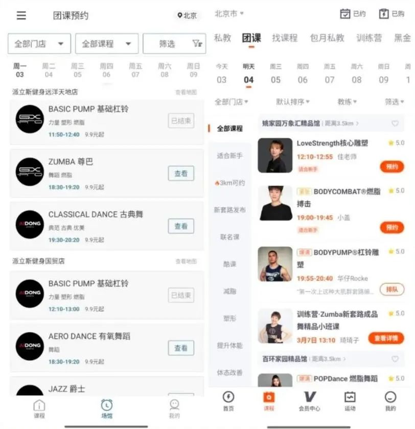 “爱动健身”是干嘛的?一张其与“乐刻健身”的界面对比图便可窥见端倪。这个爱动健身APP 与派立斯等多家健身场馆深度合作,提供课程预约和小团队课程预订服务,还利用大数据和人工智能技术分析用户健身数据,提供科学健身建议。