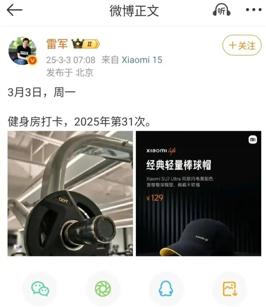 对于雷军这样的人物而言,他在社交媒体的一言一行,早已超出了个人生活分享的范畴,而是小米品牌的战略代言。雷军显然知道这一点,在带火“雷军同款皮衣”之后,他主动在健身打卡照旁附加了一款129元棒球帽。