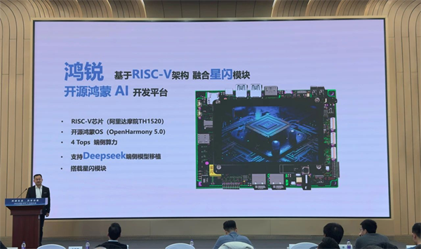 作为RISC-V工委会首届委员单位,润开鸿受邀出席大会RISC-V操作系统软件生态分论坛,润开鸿副总裁于大伍做“开源鸿蒙驱动 RISC-V 从技术到商业的跨越”主题演讲。他表示,开源指令集 RISC-V 为人工智能、汽车等重点行业带来了自主创新的新机遇。随着 Deepseek 的发布,AI 大模型正从传统的云端模式迈向云边端协同进化的全新阶段。润开鸿敏锐捕捉到这一趋势,基于 RISC-V 与OpenHarmony的双开源技术底座,精心打造了云边端协同全栈 AI 交付方案,为行业发展注入了强劲动力。同时,以本次大会为契机,润开鸿面向业内重磅发布基于“RISC-V+OpenHarmony”的“鸿锐”产品系列,并推出该系列命名的首款融合星闪且适配DeepSeek的AI开发平台。