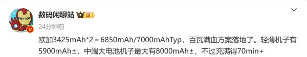据“数码闲聊站”透露,OPPO和一加的百瓦满血方案已经落地,将采用双电芯设计,每块电芯的容量为3425mAh,综合最大容量可达7000mAh。同时,OPPO和一加的轻薄新机也将内置5900mAh左右的大电池,中端新机还将落地8000mAh的超大电池。不过,OPPO和一加的8000mAh电池新机充电速度较慢,充满需要70分钟左右。