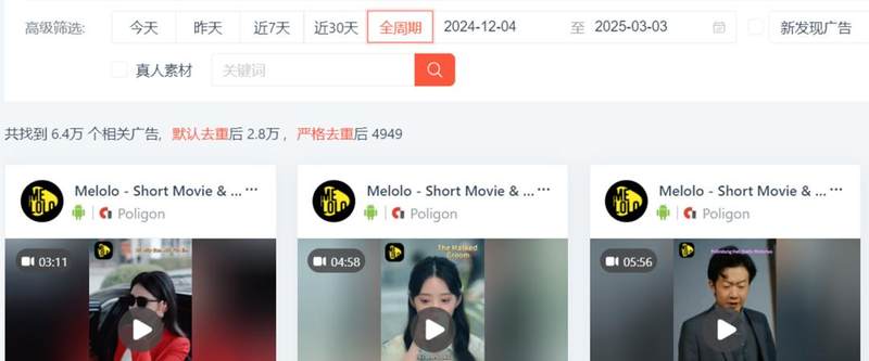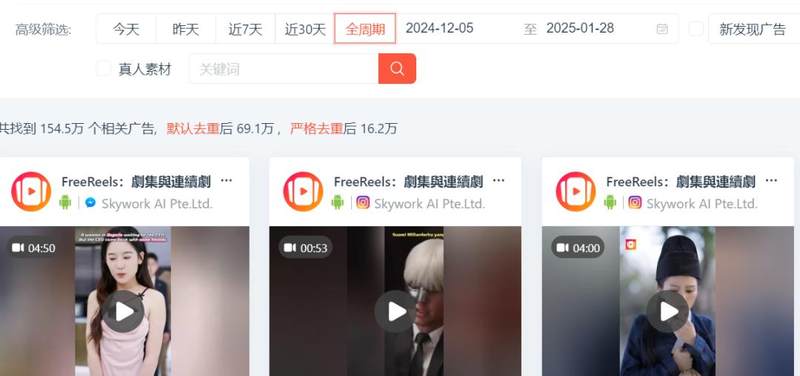 根据DataEye-ADX海外短剧版数据显示,Melolo自2024年12月4日开始投放,截至目前累计投放了近5000组去重素材。而同期,昆仑万维旗下的FreeReels投放了16.2万组去重素材。(粗略计算,FreeReels投放素材量是Melolo的30倍以上)
