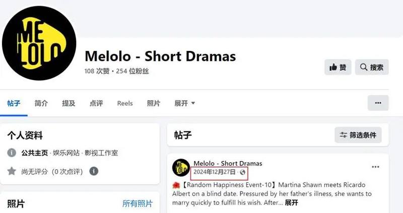 在社媒传播层面,Melolo 营销力度也不算大。截至目前,Melolo 官方账号仅进驻了 Facebook,且粉丝数仅 254 位,12 月底后未再更新,尚未入驻YouTube、INS等其他平台。