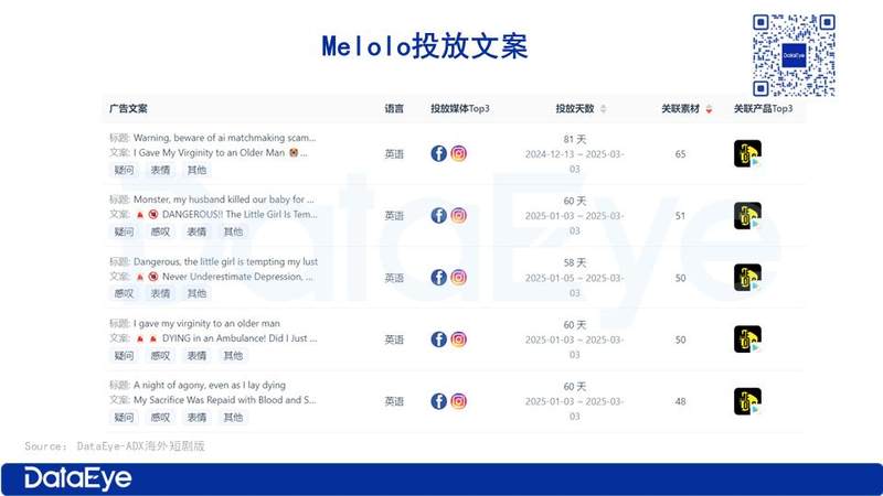 从投放文案来看,Melolo 的热门投放文案非常 “标题党”,广告文案与国内短剧文案大同小异。