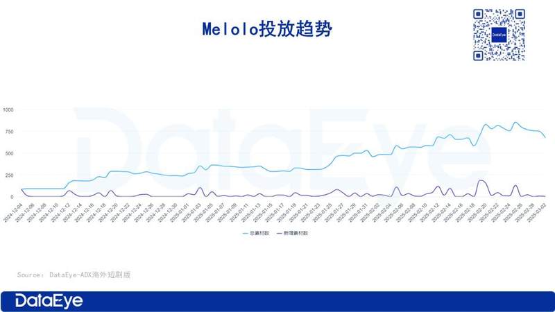从投放趋势来看,Melolo自1月下旬开始,逐步加大了素材投放力度,2月25日达到最高值853组。随后,投放素材量略有下滑,但日均投放素材量仍维持在700组左右。