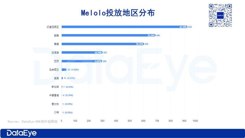 从投放市场来看,Melolo主投东南亚市场。根据DataEye-ADX海外版数据,过去90天,印度尼西亚市场的投放素材量位居首位,占比达到43.18%。越南、泰国分别以 32.24%、28.32% 的素材投放比例紧随其后,菲律宾的素材投放比例为 14.16%。总的来看,Melolo 的投放地区和下载量趋势基本保持一致。