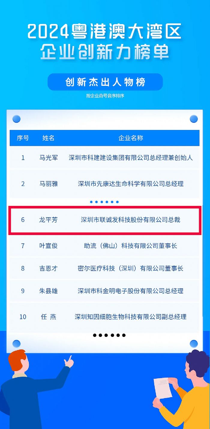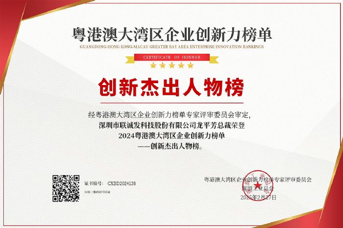 会上,揭晓了2024年度粤港澳大湾区企业创新力榜单,联诚发凭借出色的科技创新力、品牌影响力和市场表现力,成功上榜“粤港澳大湾区企业创新力榜单——高成长创新榜”, 联诚发创始人兼总裁龙平芳凭借其在智能智造与智慧显示领域的卓越贡献,荣登“创新杰出人物榜”。这一双重荣誉不仅是对联诚发创新实力的认可,更是粤港澳大湾区推动产业升级、建设全球科创高地的生动缩影。
