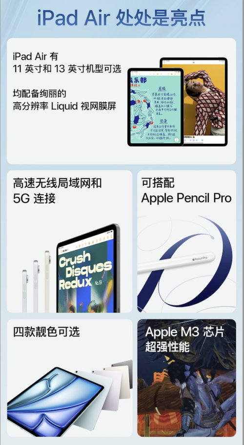新款iPad Air提供深受用户喜爱的两种尺寸与四种精美外观,11英寸机型极为便携,13英寸机型则配备了更宽大的显示屏,为发挥创意和高效工作提供更多空间。新款iPad Air运行iPadOS 18,配备先进摄像头,支持接入高速无线 5G 网络,且兼容Apple Pencil Pro与Apple Pencil(USB-C),为用户提供无与伦比的使用体验。