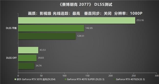 在1080P分辨率下,开启NVIDIA DLSS技术时,GeForce RTX 4070 SUPER和GeForce RTX 4070平均帧率分别为142.65帧和124.51帧,由此得出,NVIDIA DLSS技术对《赛博朋克 2077》的帧率提升效果非常显著。尤其是在NVIDIA DLSS 4的加持下,耕升 GeForce RTX 5070 追风的表现更为亮眼,帧数甚至可以高达253.16帧,展现出强大的性能。