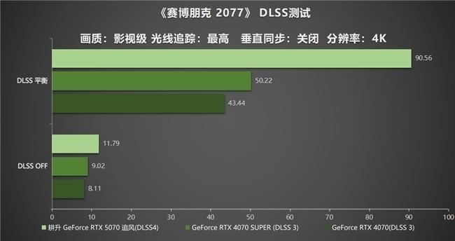 在4K分辨率下,《赛博朋克:2077》对硬件配置的要求显著提升,显卡性能成为决定游戏体验的关键因素。在开启DLSS 3后,RTX 40系列两张显卡的帧数分数跃升至50.22帧和43.44帧,充分展现了DLSS技术对提升游戏流畅度的巨大作用。而耕升 GeForce RTX 5070 追风在DLSS 4技术的加持下,更是呈现出了惊人的表现。其游戏平均帧率达到了90.56帧,为玩家提供了稳定的高分辨率游戏体验。