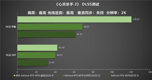在2K分辨率下,当启用DLSS 4技术后,耕升 GeForce RTX 5070 追风的平均帧数可达120.61帧,性能提升接近2倍。这一惊人的表现不仅能够让玩家充分感受到光线追踪技术带来的视觉震撼,还能在高帧率下享受流畅的游戏体验。可以说,耕升 GeForce RTX 5070 追风在DLSS 4技术的加持下,成为了让玩家可以畅玩《心灵杀手2》的理想选择。