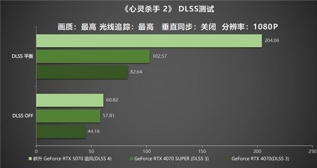 通过对《心灵杀手2》进行测试,可以观察到,在1080P的分辨率下,耕升 GeForce RTX 5070 追风在启用DLSS技术时,能达到平均204.06帧的超高帧数。相较于GeForce RTX 4070 SUPER和GeForce RTX 4070的102.57帧和82.64帧,其性能提升涨幅约为94%,展现出比前一代的两款显卡更为卓越的性能表现。