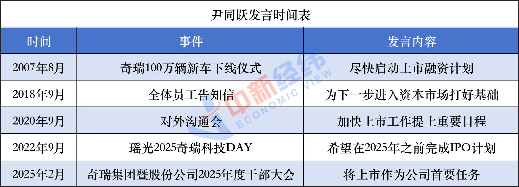 2025年2月上旬,在奇瑞集团暨股份公司2025年度干部大会上,尹同跃表示:“要将企业高质量上市作为公司首要任务。”
