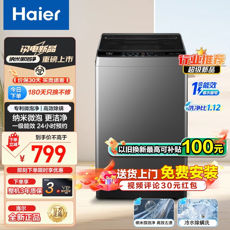 海尔高效能8公斤大容量抗菌除螨全自动洗衣机,一级能效纳米微泡,799元享健康洗涤生活