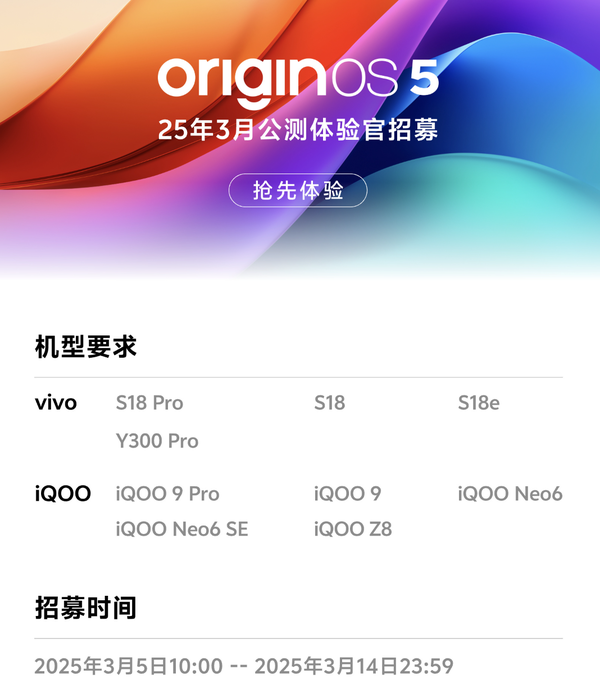 此次vivo OriginOS 5公测招募时间为2025年3月5日10:00--2025年3月14日23:59,报名方式:设置>系统管理与升级>系统升级>右上角按钮>升级尝鲜>公测报名卡片点击【查看详情】按钮,进入公测报名界面,按照提示完成报名申请。