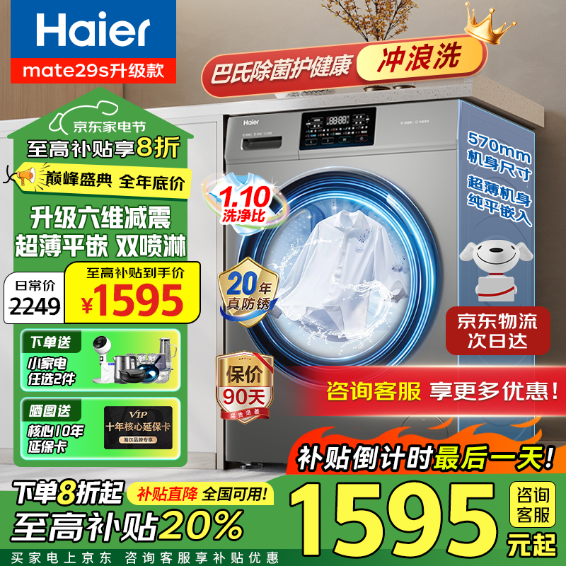 海尔超薄高效XQG100-607H洗衣机:1.1洗净比,大容量,六维减震,仅售1590元起