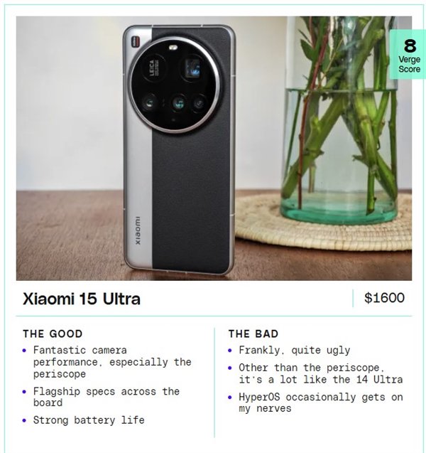 最后,TheVerge的编辑评测了小米15 Ultra手机,结论是如果不在乎外观,这是一款强大的拍照手机。