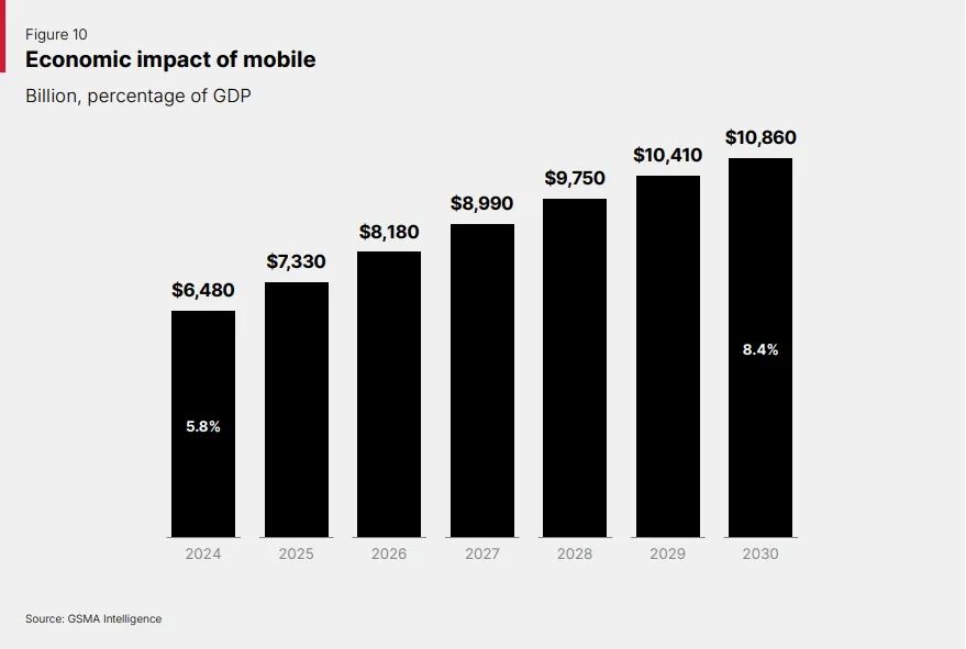 ·2024年,移动技术和服务贡献了全球GDP的5.8%(相当于6.5万亿美元的经济价值)。到2030年,这一贡献预计将增至近11万亿美元,占全球GDP的8.4%。