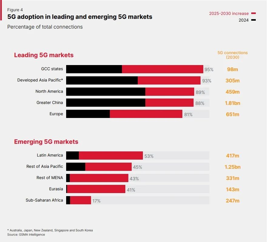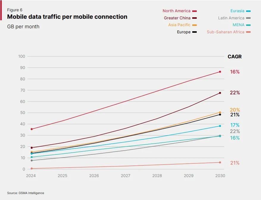 2024年底,全球5G连接数突破20亿,预计到2030年将占移动连接总数的57%。