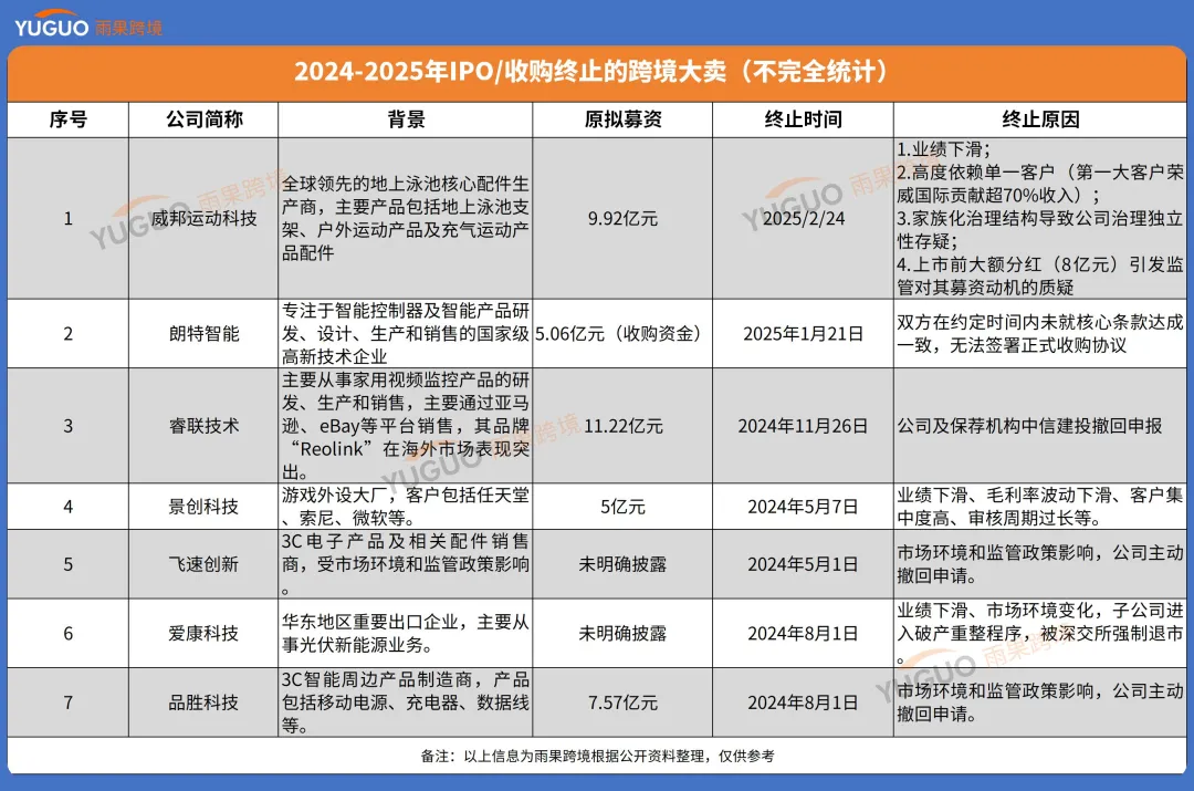 据不完全统计,包括威邦运动科技、朗特智能、睿联技术、景创科技、飞速创新、爱康科技和品胜科技在内的多家知名企业,纷纷终止了IPO或收购计划。