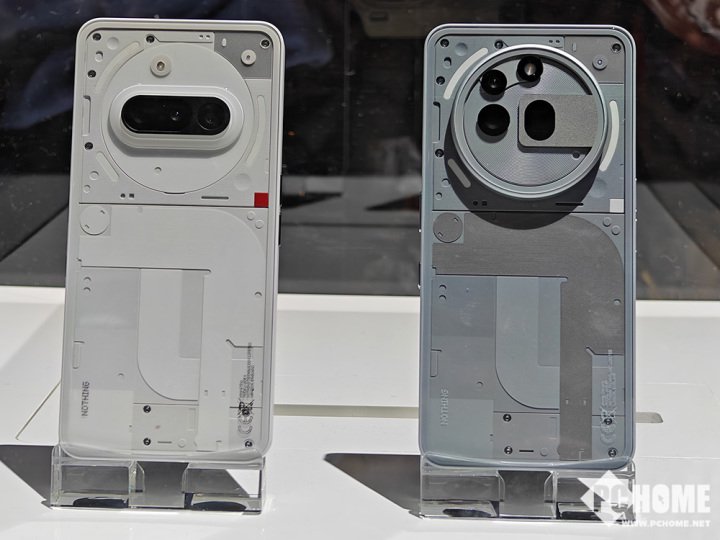 标准版采用了橫置镜头设计,三颗后置镜头垂直排列。Pro版则采用了“三角形”布局。根据Nothing Phone方面表示,两款机型均采用了5000万像素主摄、5000万像素长焦和800万像素超广角,不过从内部结构来看,长焦镜头可能存在差异性,Pro版可能使用的是潜望长焦镜头。