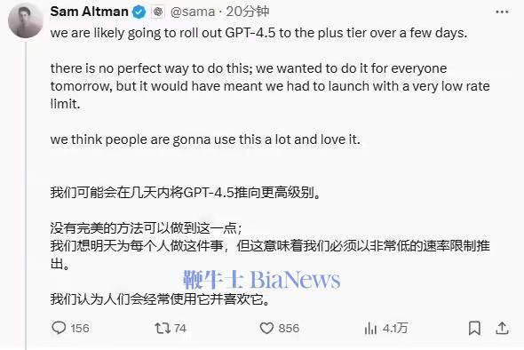 鞭牛士 3月5日消息,今日,OpenAI CEO山姆·奥特曼在社交平台发文称,OpenAI很可能会在未来几天内将GPT-4.5逐步推送给高级用户(Plus用户)。