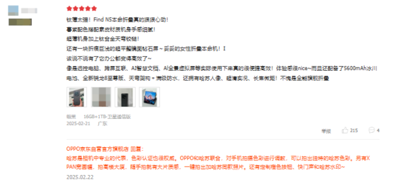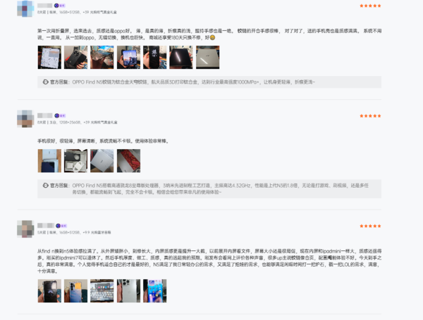 首批用户在收到OPPO Find N5后第一时间对其外观设计做出了综合性赞赏,尤其是最初担忧手机会很重的用户在收到手机后都表示“手机很轻薄”,“携带起来非常方便”等等,再加上机身很小巧,跟直板机没有什么区别,可以轻松放入口袋或包包中。