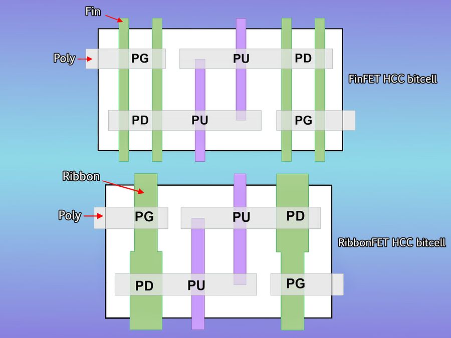 对于 FinFET 器件,SRAM 的传输栅极 (PG) 和下拉 (PD) 晶体管需要比其他晶体管驱动更多的电流,因此它们由两个鳍片制成。使用纳米片晶体管,SRAM 可以具有更灵活的设计。在 Intel 的大电流设计中,PG 器件比其他器件更宽,但 PD 晶体管甚至比这更宽,以驱动更大的电流。英特尔