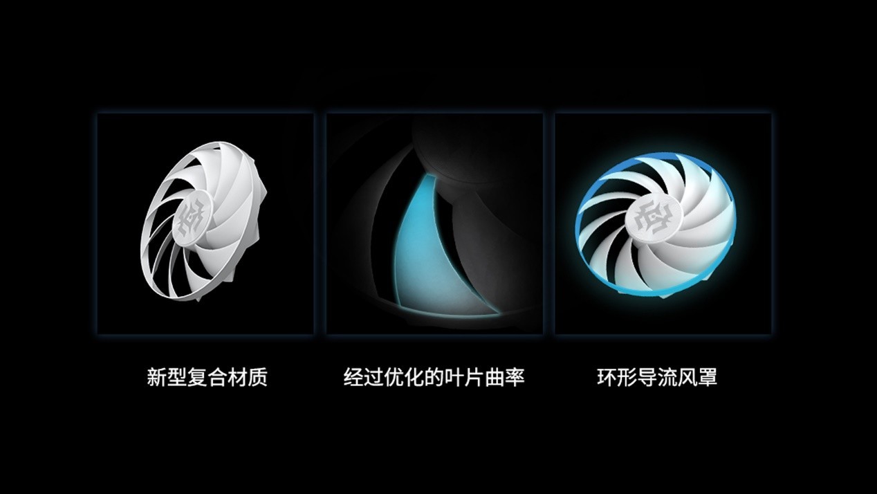 显卡导流罩的风扇也升级为高性能环刃风扇。这种独特形状的风扇采用新型复合材质,优化叶片曲率,能进一步提升风量,优化风压并降低风噪,运行更安静、结构更稳定,大大提升显卡散热效率。同时风扇支持智能启停技术,不仅能减少运行噪音,还能增加风扇寿命。