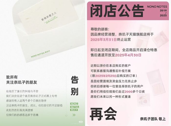 【亿邦原创】3月5日,创立于2019年的新锐美妆品牌奈玑子在小红书发布品牌告别信,称奈玑子各平台官方店铺将于2025年3月底陆续停止销售,售后服务将持续至2025年4月30日。截至目前,奈玑子天猫旗舰店已发布闭店公告,称店铺将于2025年3月31日终止运营。