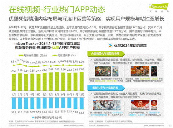 艾瑞数据显示,随着《白夜破晓》《清明上河图密码》等剧集播放,2024年12月,优酷活跃用户同比增长6.2%,超过视频行业整体增速3.3的百分点,位列行业第一;年度月活同比增长5.1%,连续11个月实现正增长。
