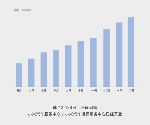 此外,根据官方数据,截止2025年2月28日,小米汽车在全国共拥有220家门店,覆盖全国65座城市。2月,小米汽车新增门店数量为5家,预计3月将新增16家门店,新增覆盖城市包括哈尔滨和邢台。此外,截止2025年2月28日,已有33家小米汽车服务中心与授权服务中心开业。