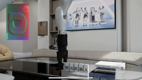 (图示:在AgiBot Digital World仿真框架中,智元机器人展示与千觉机器人合作的触觉感知仿真)