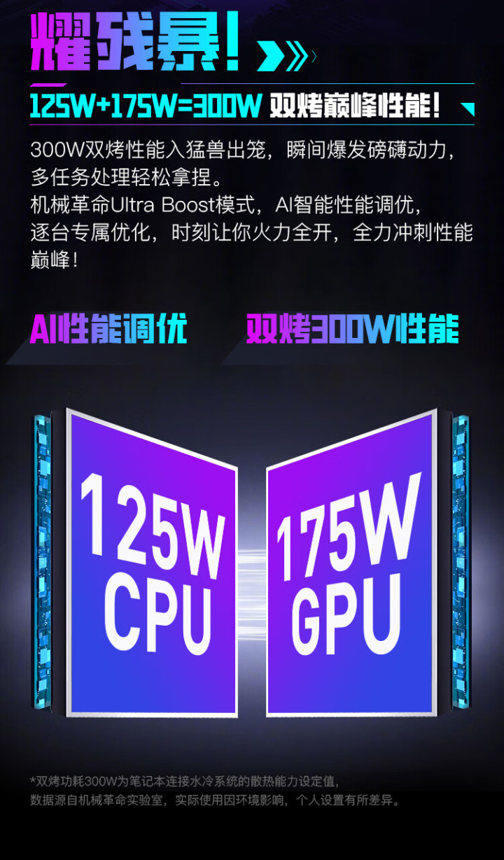 更令人瞩目的是,在机械革命Ultra Boost模式和AI智能性能调优的帮助下,整机双烤测试功耗稳定在300W(处理器125瓦+显卡175瓦),持续地满血释放彻底突破了传统游戏本的性能瓶颈,重新定义旗舰游戏本的性能天花板。无论是硬核玩家还是专业创作者,耀世16 Ultra都将让你获得超极致的性能体验。