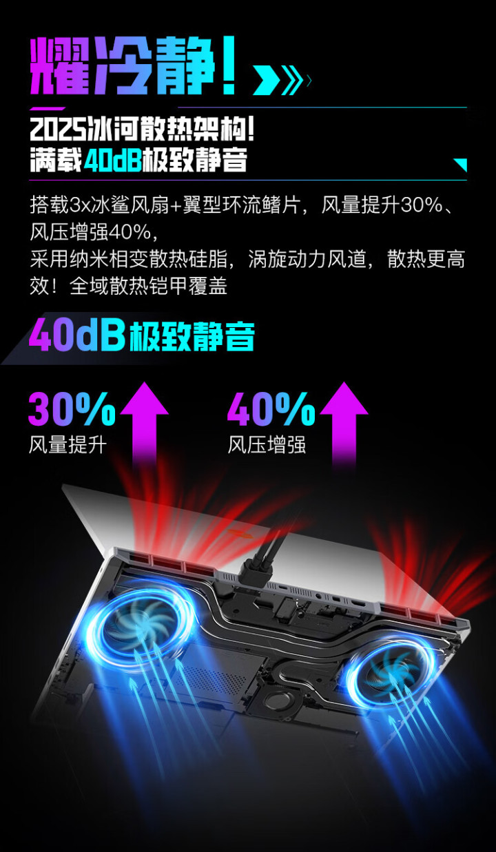 如此极致的性能表现自然离不开高效的散热系统,耀世16 Ultra使用的全新冰河散热架构配备三把冰鲨风扇,搭配翼型环流鳍片,风量暴增30%,风压增强40%,纳米相变散热硅脂+涡旋动力风道,散热更高效。即使连续酣战数小时,键盘区也仅是温热触感,不必担心过热。外接分体式水冷,无需工具即可拆装,稳稳锁定300W性能输出,确保玩家们在百人团战中也能做到全程满帧。40dB的满载噪音更是图书馆级静音,深夜开黑再也不怕吵醒室友。