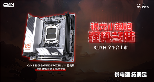 快科技3月5日消息,七彩虹今天正式发布了新款主板“CVN B850I GAMING FROZEN V14登陆舰”,这也是七彩虹旗下AMD平台主板的第一款ITX迷你型号,将于3月7日正式开卖。