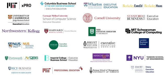 截至目前,我们与麻省理工学院、沃顿商学院、哥伦比亚大学、哈佛大学、剑桥大学、复旦大学、欧洲工商管理学院、加州大学伯克利分校等多所大学展开了合作。我们独特的教育模式,融合了先进的科技、课程创新、以及来自知名大学资深名师的教授和辅导,已为80多个国家和地区的超过35万名学员提供了线上和线下未来能力培训和教育。